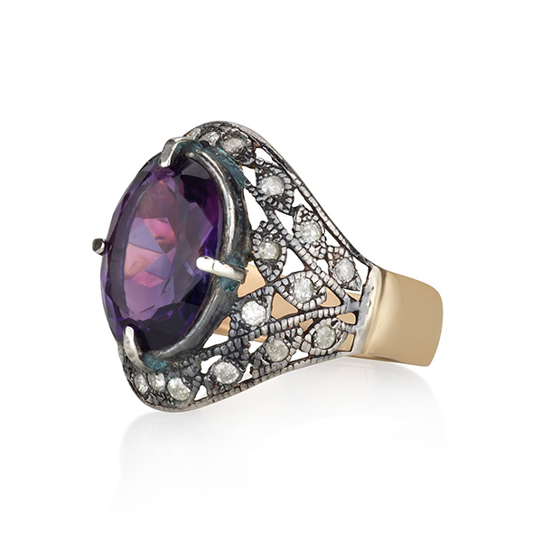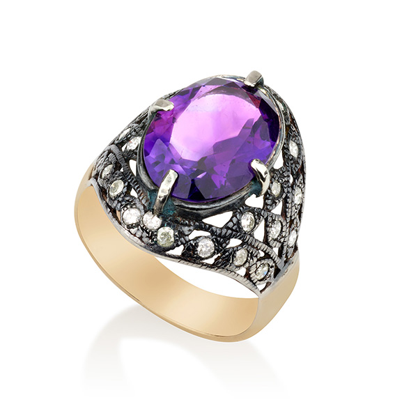 A ring with an ancient design. Inlaid with a 5-carat amethyst stone. And around diamonds