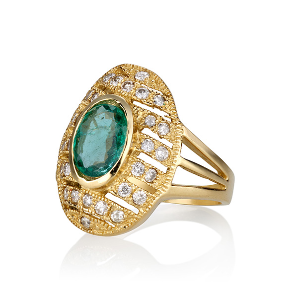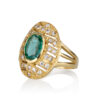 14k yellow gold ring. Embellished with emeralds and natural diamonds.