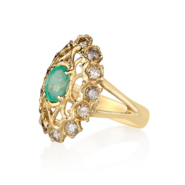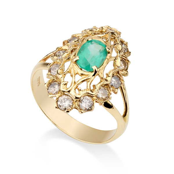 14k yellow gold ring. Diamonds and an emerald stone in a luxurious oval polish.