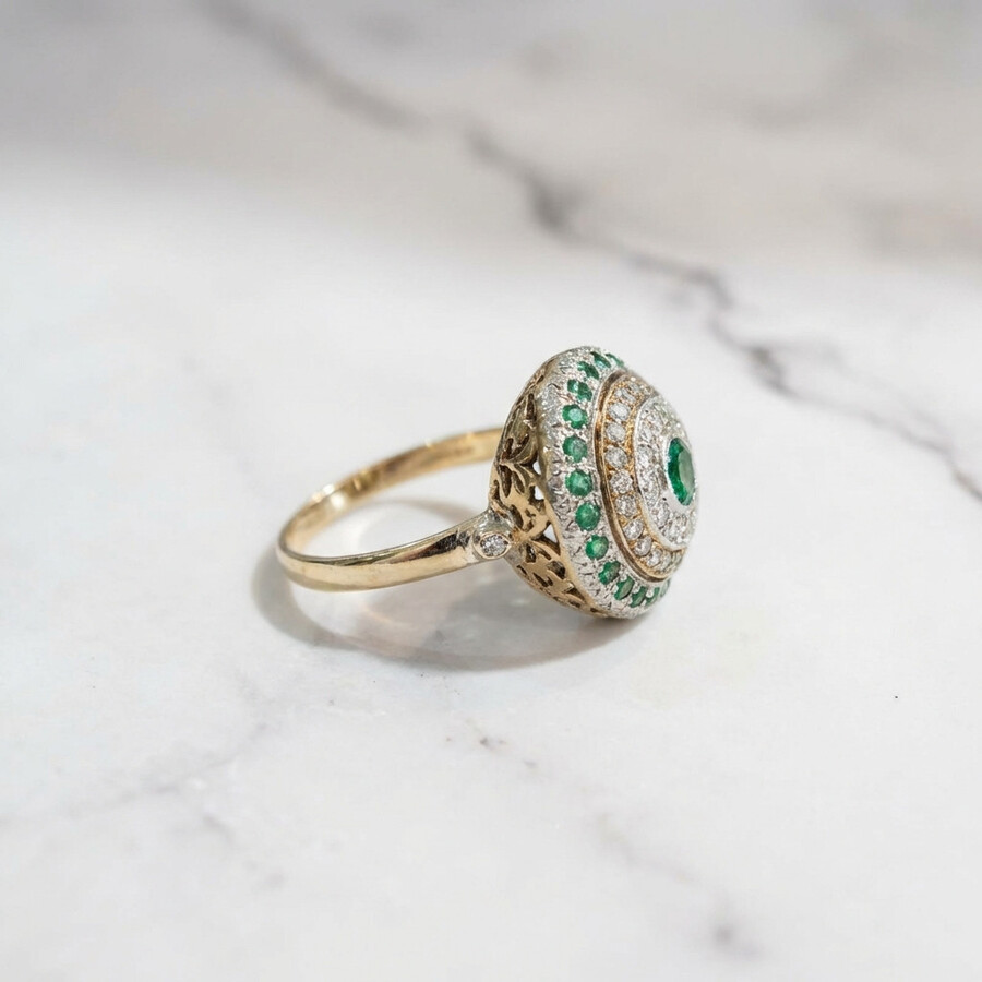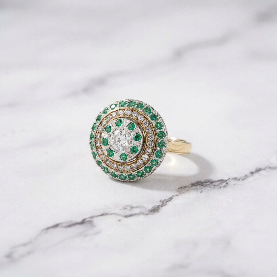 A vintage yellow gold ring set with circular rows of luxurious emeralds and natural diamonds, and in the middle a natural diamond in a circular shape. Artistic design by an artist with a mind for creating exclusive and unique art that is only yours, without competitors!