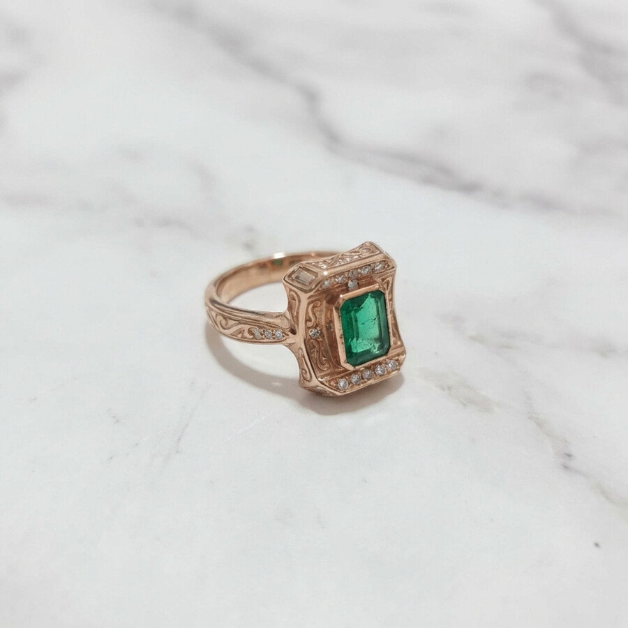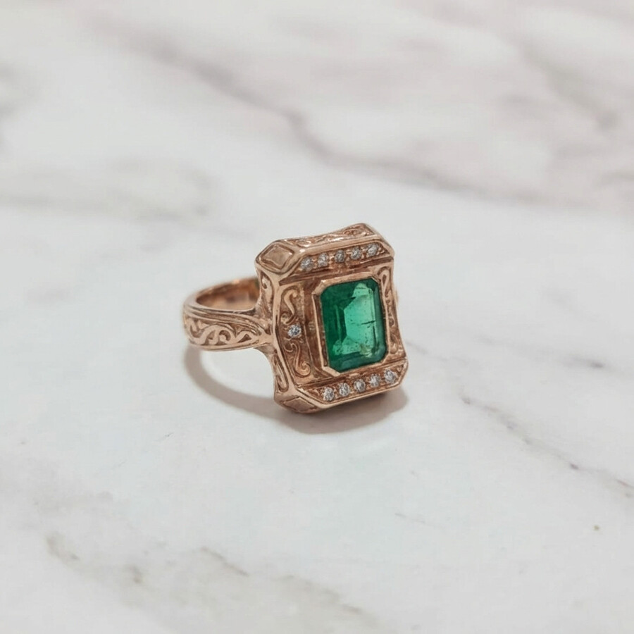 A vintage design ring engraved with ancient art engravings in special rose gold, set with a natural emerald stone, approximately 2-2.50 carats, and tiny diamonds on the sides, an elegant and luxurious look that you won’t be able to take your eyes off.