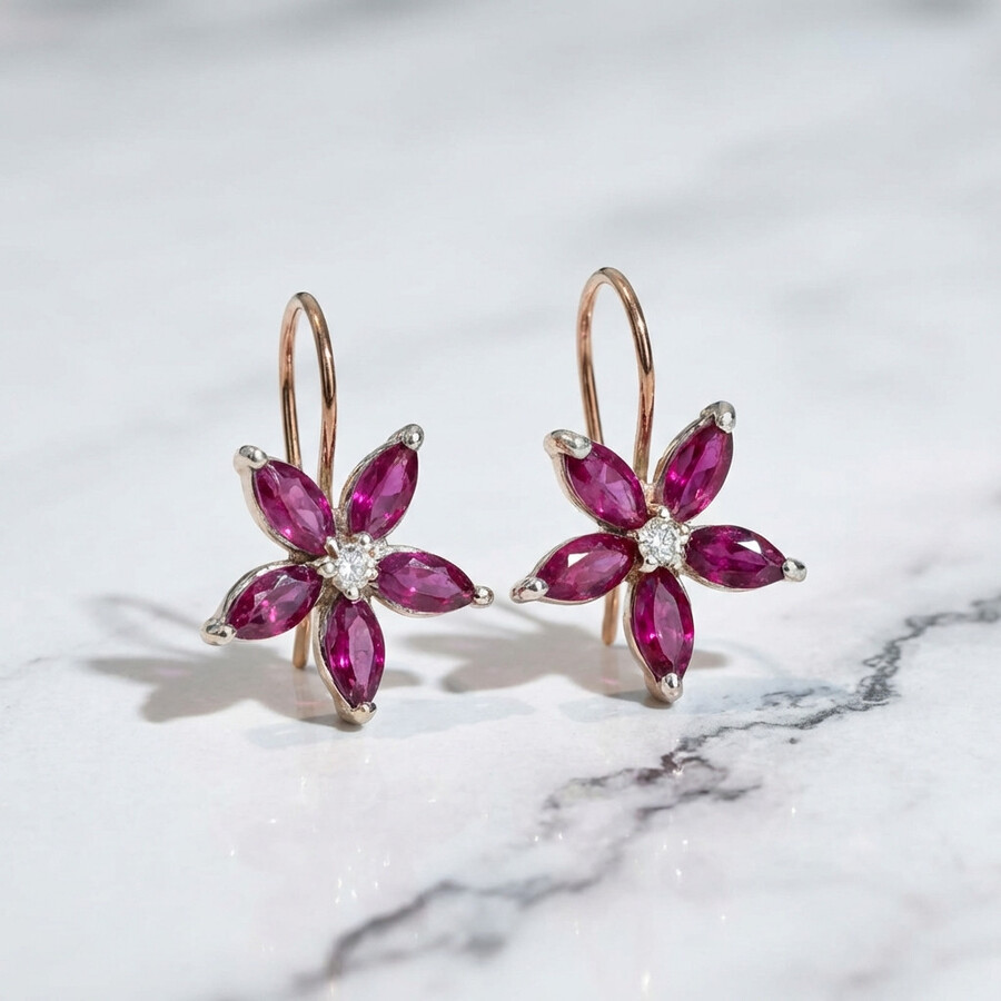 Vintage design with real rubies in clean marquise cuts, original stones, a central diamond in each earring, white gold and rose gold on the back, a luxurious earring that symbolizes elegant luxury