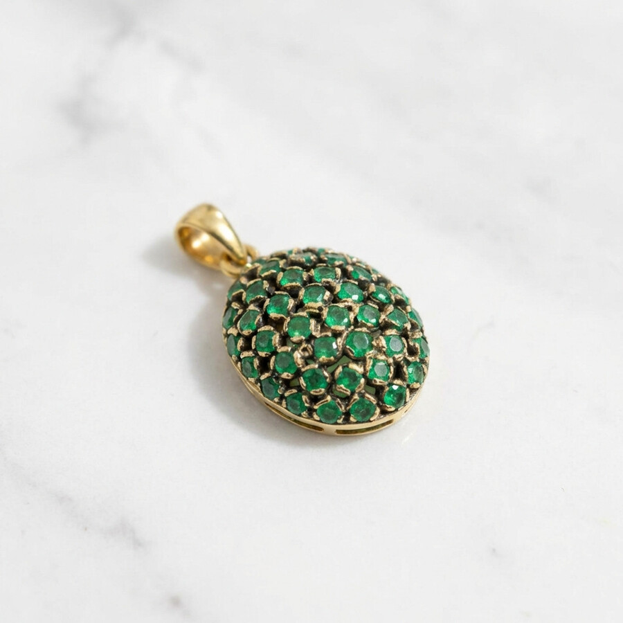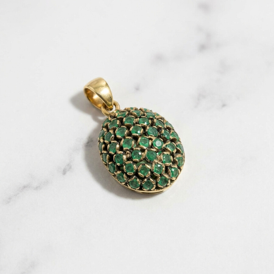 A vintage-style pendant that exudes a classic and luxurious look, made of shiny yellow gold, all encrusted with high-quality, luxurious, sparkling emeralds, set in handmade cups to create the most brilliant and perfect look, which gives a special contrast to the gemstones for an exclusive and unusual design that sets it apart from the rest.