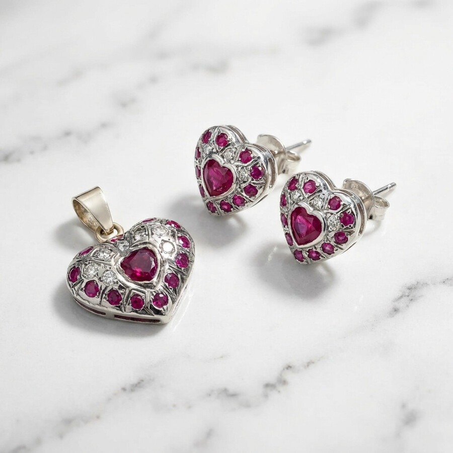 A vintage English design pendant made of blackened silver engraved with engravings and artistic decorations around the diamonds. This combination is in yellow using an ancient art technique and in its center is a feather ruby set in a heart and sparkling with natural diamonds. A unique classic design.