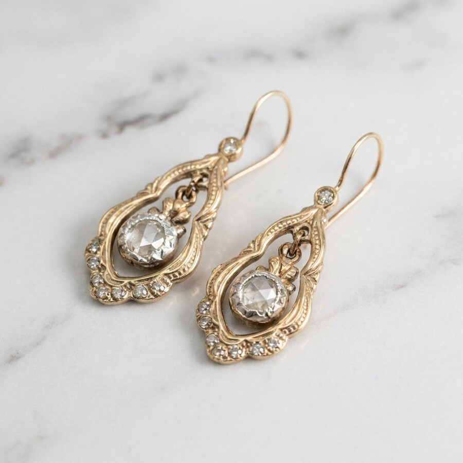 Vintage earrings, dangling design, vintage Edwardian style, yellow gold, decorated with unique artistic decorations, set with natural diamonds in old-cut rose-cut finishes, special design, one-of-a-kind