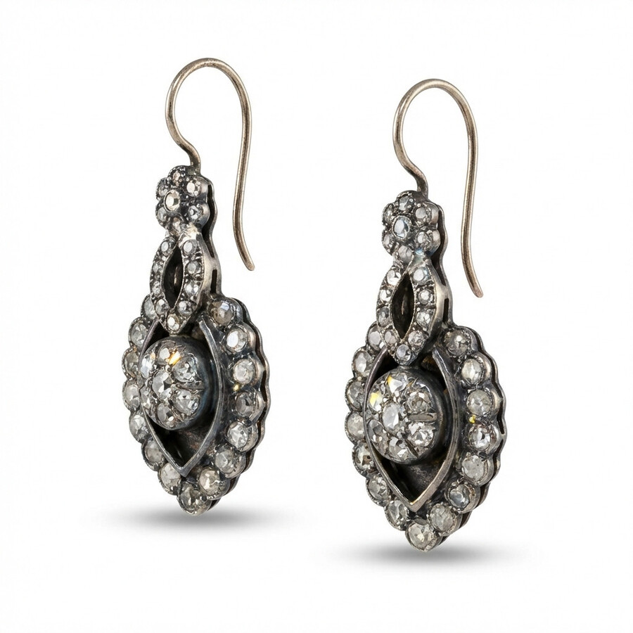Vintage design earrings, blackened silver, rose gold combination, set with rose cut diamonds