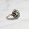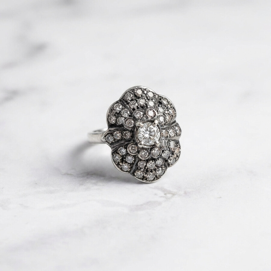 Vintage design ring in English work style. The vintage collection is set in a blackened silver frame combined with yellow gold. Inlaid with sparkling brilliant diamonds, artistically handmade. An elegant look in a very luxurious vintage style.