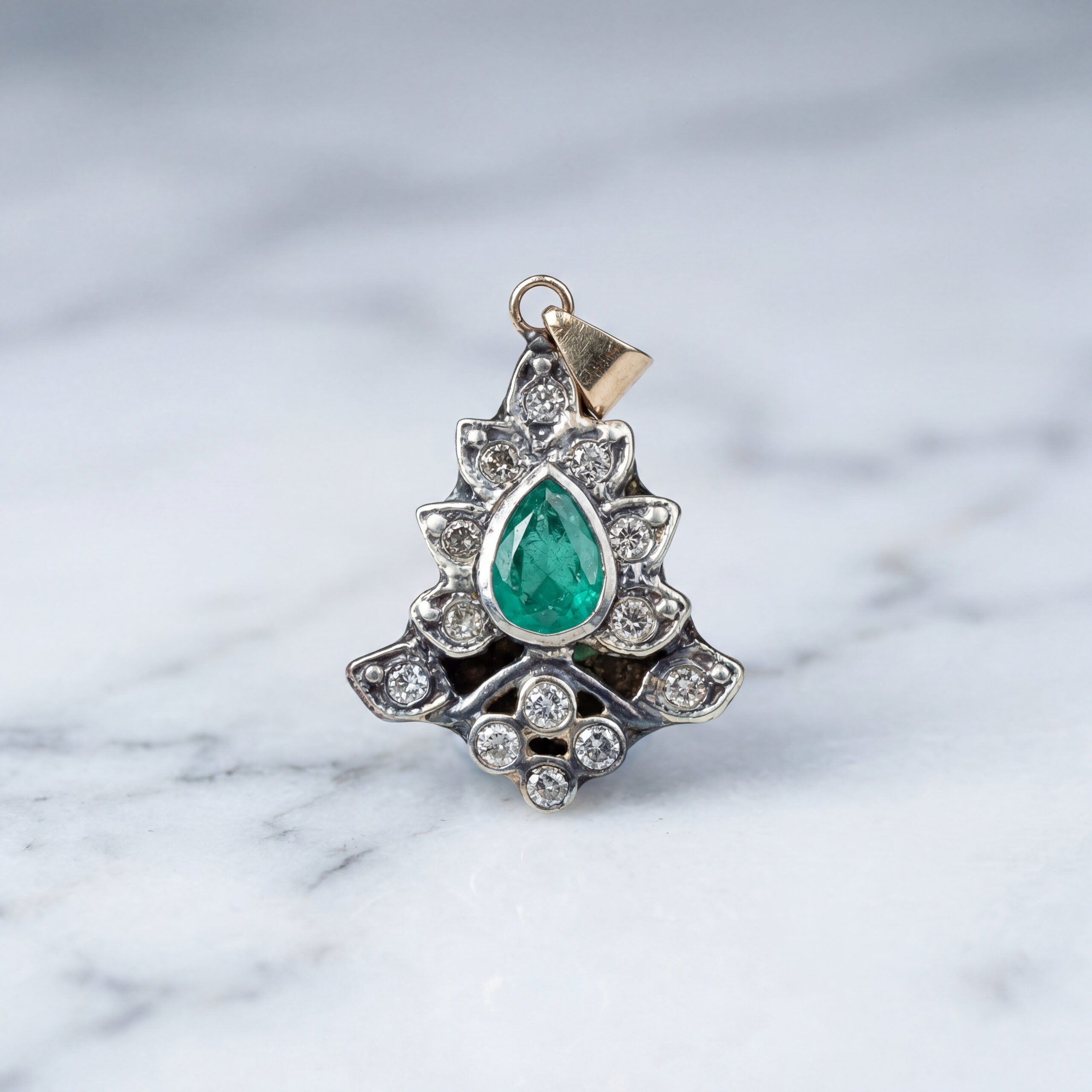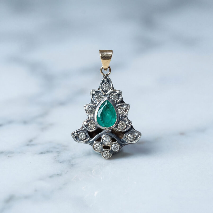 A rare encounter with history and artistry, this Extraordinary Teardrop Pendant is a tribute to a bygone era of jewelry making. At its heart lies a magnificent Natural Emerald (2.50 – 3.00 Carats), boasting a unique, vivid hue and a classic pear-cut silhouette. Encircled by Natural Diamonds and set in a high-contrast blend of Blackened Silver and Yellow Gold, this pendant is a “one-of-a-kind” masterpiece that defines artisan luxury.
